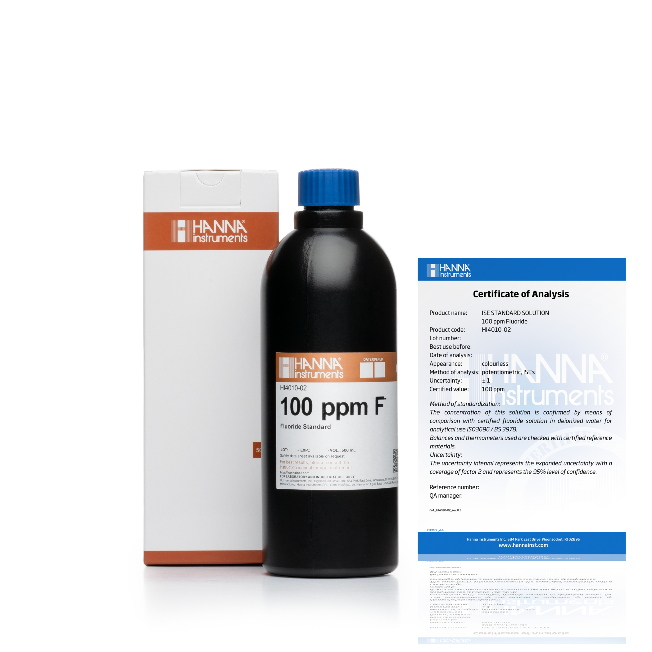 Dung dịch này được sử dụng để hiệu chuẩn điện cực chọn lọc ion trạng thái rắn fluoride (ISE). Các dung dịch chuẩn Hanna ISE được sản xuất với các hóa chất có độ tinh khiết cao và được đóng chai trong nhà máy hiện đại của Hanna. Các điện cực ISE cần được hiệu chuẩn để có thể đọc kết quả chính xác khi thực hiện các kỹ thuật đo lường như đo trực tiếp và phương pháp gia số. Nên hiệu chuẩn lên đến hai điểm để tăng độ chính xác. Thủy tinh thể tích có thể được sử dụng để pha loãng các dung dịch chuẩn để cố định nồng độ mong muốn của mẫu được đo. Các dung dịch hiệu chuẩn ISE và dung dịch mẫu luôn phải có cùng độ ion.