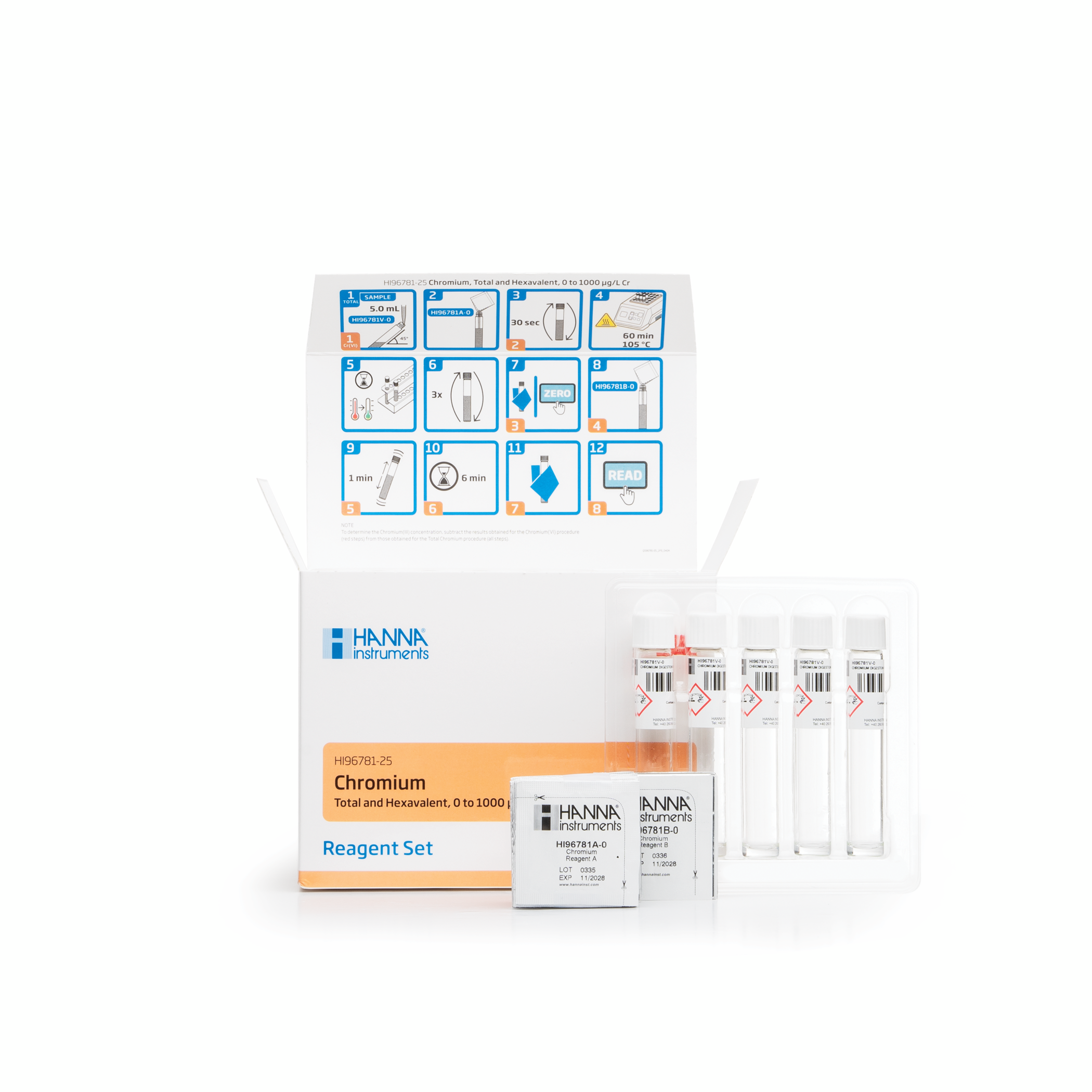 The HI96781-25 are high-quality reagents that are pre-measured, allowing for users to achieve fast and accurate colorimetric measurements. These reagents use an adaptation of Standard Methods for the Examination of Water and Wastewater, 23rd Edition, 4500 ClO2 D method. The chromium in the sample is oxidized to hexavalent chromium during digestion. The hexavalent chromium reacts with the Diphenylcarbazide to form a red color proportional to the amount of chromium in the sample. This method has a strong temperature and pH dependence. The sample temperature must be between 18 and 22℃ and the pH between 3 and 9.