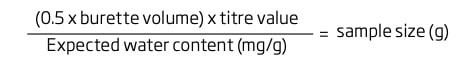 Người dùng cần tính toán thể tích mẫu phù hợp trước khi tiến hành chuẩn độ, đầu tiên chúng ta cần xác định được nồng độ của chất chuẩn độ, nộng độ H2O có thể có trong mẫu và thể tích của Buret. Khi có được các thông số trên, người dùng chỉ cần tính toán theo công thức sau: