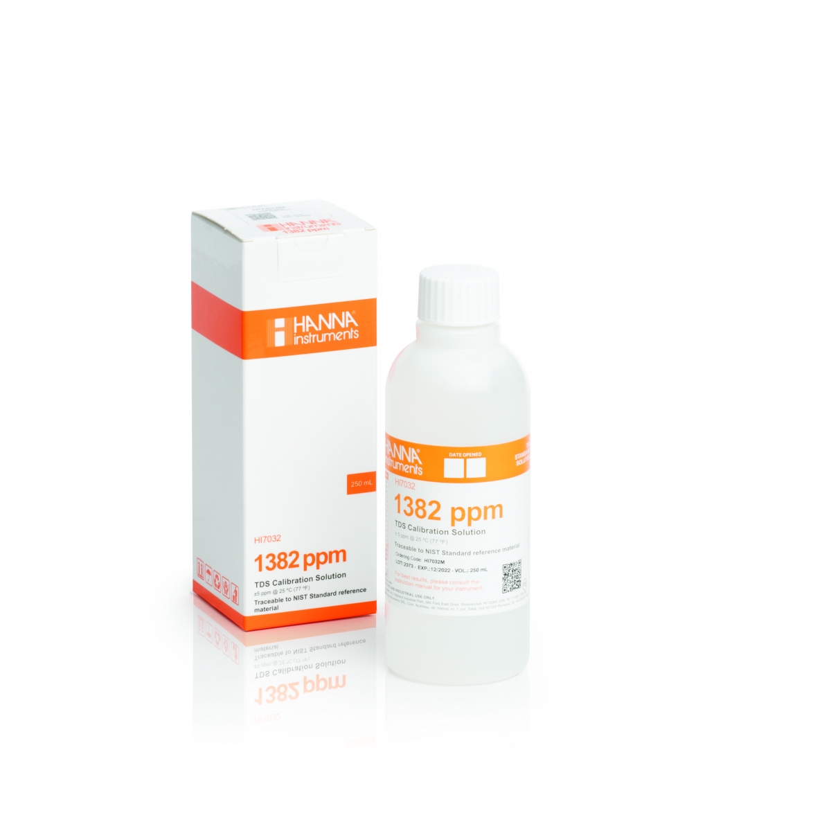 - HI7032 là một dung dịch tổng chất rắn hòa tan (TDS) chuẩn tại 1382mg/L chất lượng cao được sản xuất theo tiêu chuẩn ISO 3696/BS3978 với muối tinh khiết cao, nước khử ion, và thủy tinh loại A trong môi trường kiểm soát nhiệt độ theo dõi với nhiệt kế đã được chứng nhận. Giá trị được báo cáo theo Tài liệu tham khảo tiêu chuẩn NIST (SRMs).