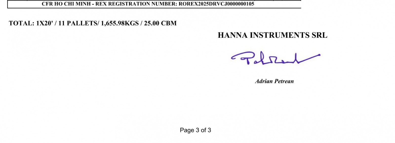 Giấy chứng nhận REX xác nhận HANNA INSTRUMENTS là Nhà sản xuất đã đăng ký tại EU, đáp ứng đầy đủ tiêu chuẩn xuất xứ hàng hóa từ châu Âu.